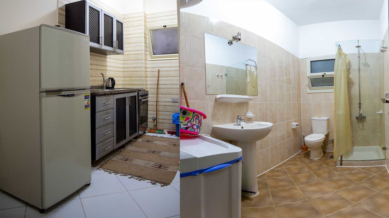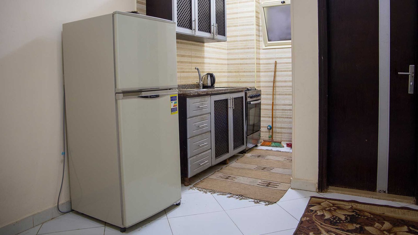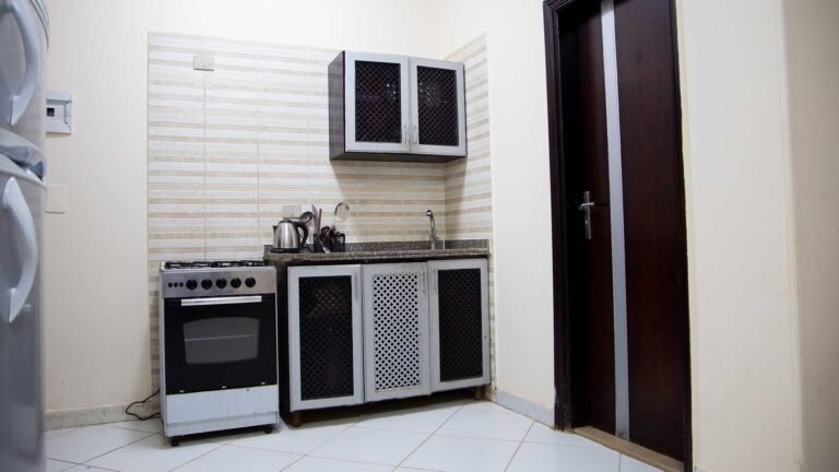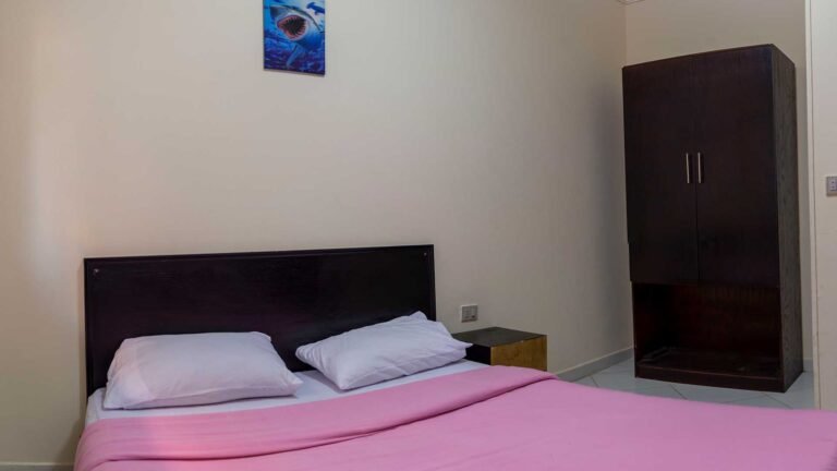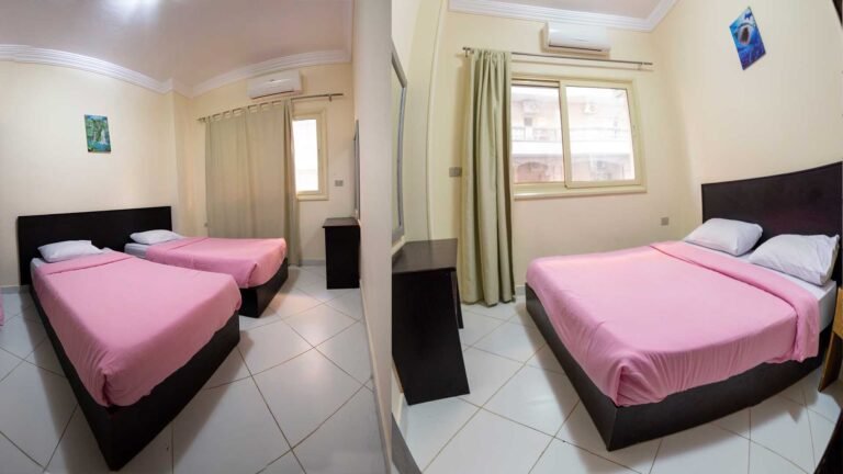 مساحة 85 متر (غرفة بسرير كبير + غرفة بسريرين + 1 كنبيه سرير + مطبخ + حمام + بلكونة)